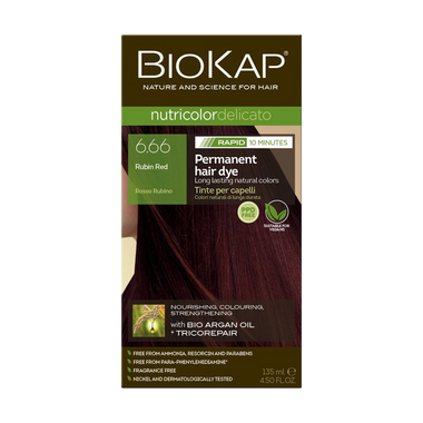 BioKap Nutricolor Delicato 6.66 Rapid Ruby Red, the BioKap Nutricolor RAPID formula dyes your hair naturally in just 10 minutes. It is a non-drip formulation and protective cape supports ease of application and use. BioKap Nutricolor Delicato 6.66 Rapid Ruby Red is made with Bio Argan oil & Tricorepair, a complex with rice proteins, willow derivative and lipophilic fruit acids supports bleaching the hair by two tones naturally and gently.